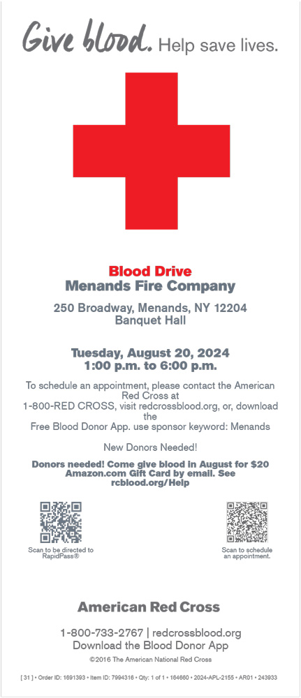 The Menands Fire Company is sponsoring an American Red Cross Blood Drive on Tuesday, August 20, 2024, at the Menands Banquet Hall from 1:00 to 6:00 p.m. Please stop by and donate blood, you will be providing a life saving community service.